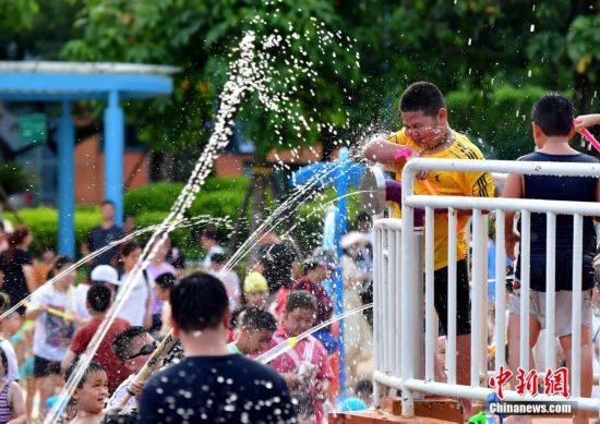 圖為福州兒童公園戲水樂園吸引了許多小朋友前來戲水享清涼。張斌 攝