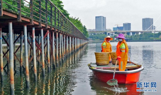 8月14日,王桂藥和妻子劉鳳美在福州市浦下河打撈垃圾。新華社發(fā)(周義 攝)