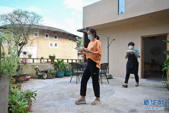 8月17日,在福建省漳州市南靖縣書(shū)洋鎮(zhèn)塔下村一處民宿,在此就業(yè)的村民為客人端上早點(diǎn)。