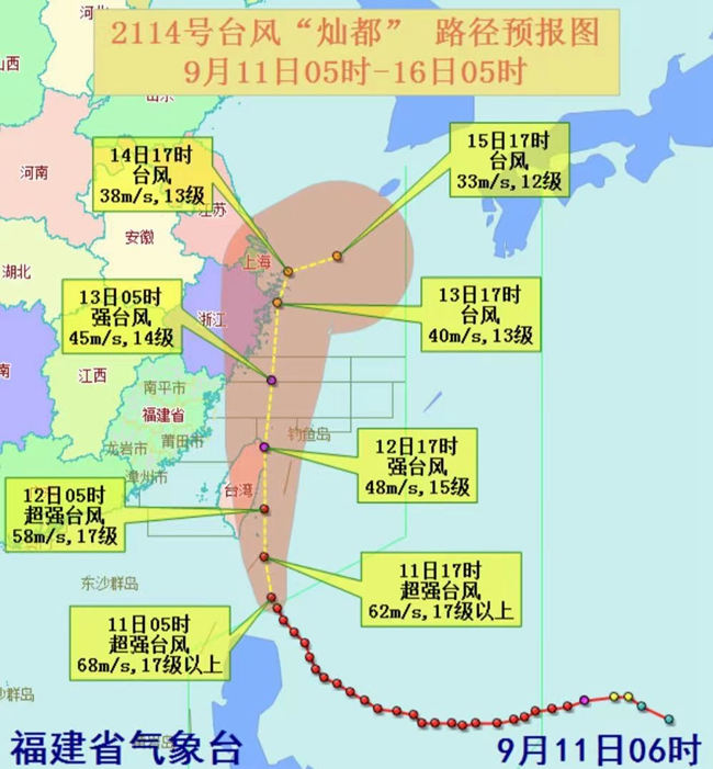 氣象部門相關(guān)負(fù)責(zé)人表示,14號(hào)臺(tái)風(fēng)“燦都”11日5時(shí)中心位于臺(tái)灣省宜蘭縣偏南方向約530公里的巴士海峽上,中心附近最大風(fēng)力62米/秒(17級(jí)以上,超強(qiáng)臺(tái)風(fēng)級(jí))。預(yù)計(jì)“燦都”將以每小時(shí)15~20公里的速度向北偏西方向移動(dòng),強(qiáng)度緩慢減弱,逐漸向臺(tái)灣島東部沿海靠近,12日白天將登陸或擦過臺(tái)灣島東部沿海,爾后穿過福建省外海漁場(chǎng),逐漸向浙江東北部沿?拷