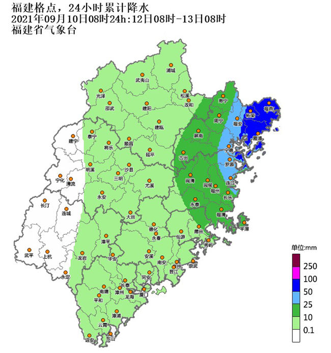 12日8時(shí)—13日8時(shí)降雨落區(qū)預(yù)報(bào)圖。福建省氣象臺(tái)供圖