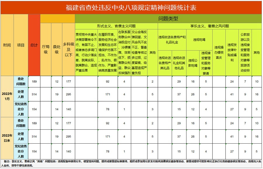 處理314人 2022年1月福建查處違反中央八項(xiàng)規(guī)定精神問題189件