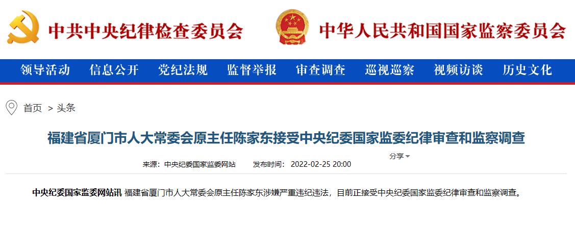 據(jù)中央紀委國家監(jiān)委網(wǎng)站消息,福建省廈門市人大常委會原主任陳家東涉嫌嚴重違紀違法,目前正接受中央紀委國家監(jiān)委紀律審查和監(jiān)察調(diào)查。