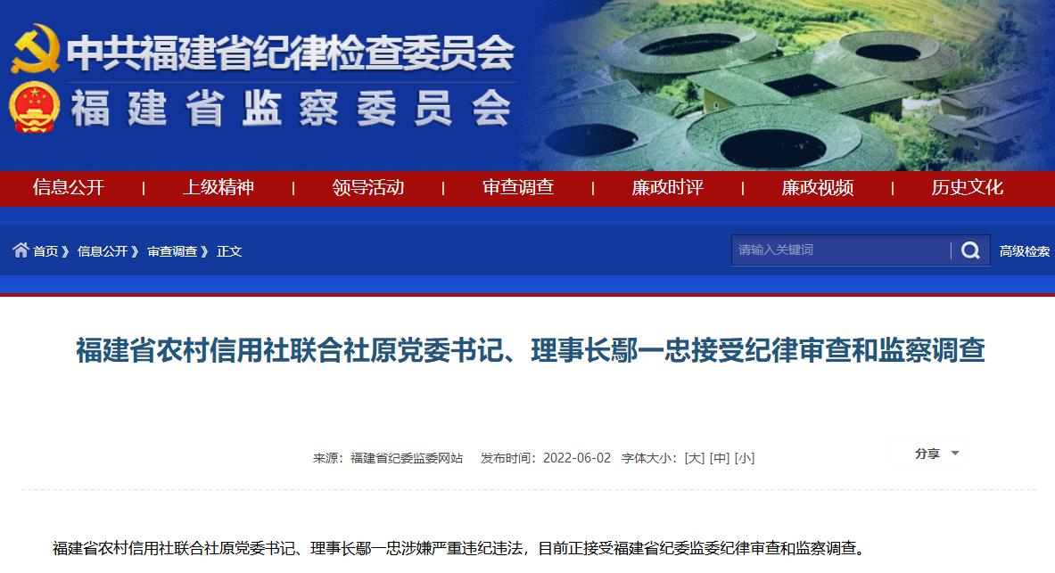 據(jù)福建省紀委監(jiān)委網(wǎng)站6月2日消息,福建省農村信用社聯(lián)合社原黨委書記、理事長鄢一忠涉嫌嚴重違紀違法,目前正接受福建省紀委監(jiān)委紀律審查和監(jiān)察調查。