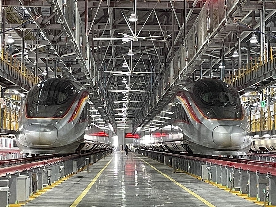 智能復興號動車組停放在福州南動車二所動車檢修庫內(nèi)。福州動車段供圖