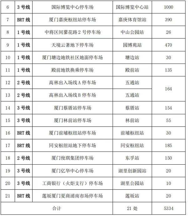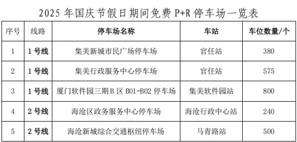 廈門市還布局21個免費(fèi)P+R停車場:本次國慶期間,全市共推出21個停車場、5334個車位,面向地鐵換乘車主免費(fèi)開放,覆蓋廈門六區(qū)及線網(wǎng)各條線路。 用戶可通過“廈門地鐵”APP、“廈門交通”小程序或“i車位”微信公眾號完成一次登記后,即可使用停車換乘服務(wù),國慶期間免費(fèi)停車。