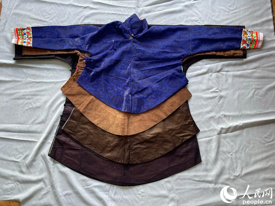 左圖為“亮貝”,母親送給女兒的婚衣禮服;右圖為“小橄欖造底”,是女兒送給母親的祝壽禮服。人民網(wǎng) 楊灝昱攝